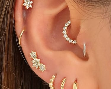 Amplo Catálogo: Atendemos a todos os tipos de perfuração, desde o lóbulo tradicional, passando por cartilagens complexas (Hélix, Tragus, Daith, Conch, Rook), até piercings faciais, corporais e microdermais.